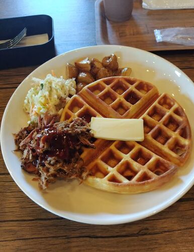 RADの間借り食堂アンキカフェに寄ってみたら、RADの間借り食堂が急遽開催されていたので、注文しました。#ワッフル#プルドポーク#チョコバナナジュース ワッフルふわふわで美味しい。プルドポークは昨日のめっちゃ美味しいやつ!最高!ポテトもコールスロー…